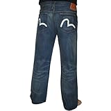 Evisu's premium denim line continues to sit at the helm of premium denim brands reinforced with its superior quality and unique style. These jeans feature a loose relaxed fit, contrast stitching, a button fly, a leather patch sewn on the waistband and logo painting on the back pockets. 100% Cotton. Machine wash, tumble dry. Size 40= Waist 40", Inseam 32", Rise 11.5, Leg Opening 11" (Laying Flat). Style # EAU08GMJE09A D048. Read more